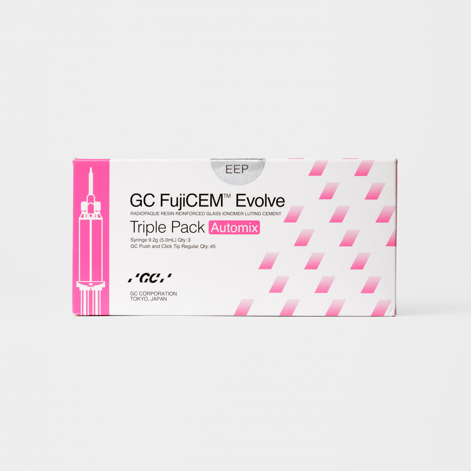 GC FujiCem Evolve Automix Universal – это универсальный фиксирующий стеклоиономерный цемент, оптимизированный для фиксации зубных протезов из диоксида циркония. Также материал может применяться для временной и постоянной фиксации металлических и металлокерамических коронок, а также вкладок и композитных материалов.