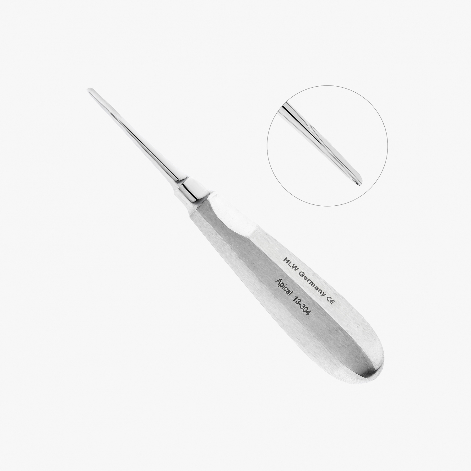 Для удаления корней зубов верхней челюсти, атипично расположенных зубов верхней челюсти и, в ряде случаев, для удаления третьих моляров нижней челюсти применяется апикальный элеватор. Производителем инструмента является компания HLW Dental Instruments.