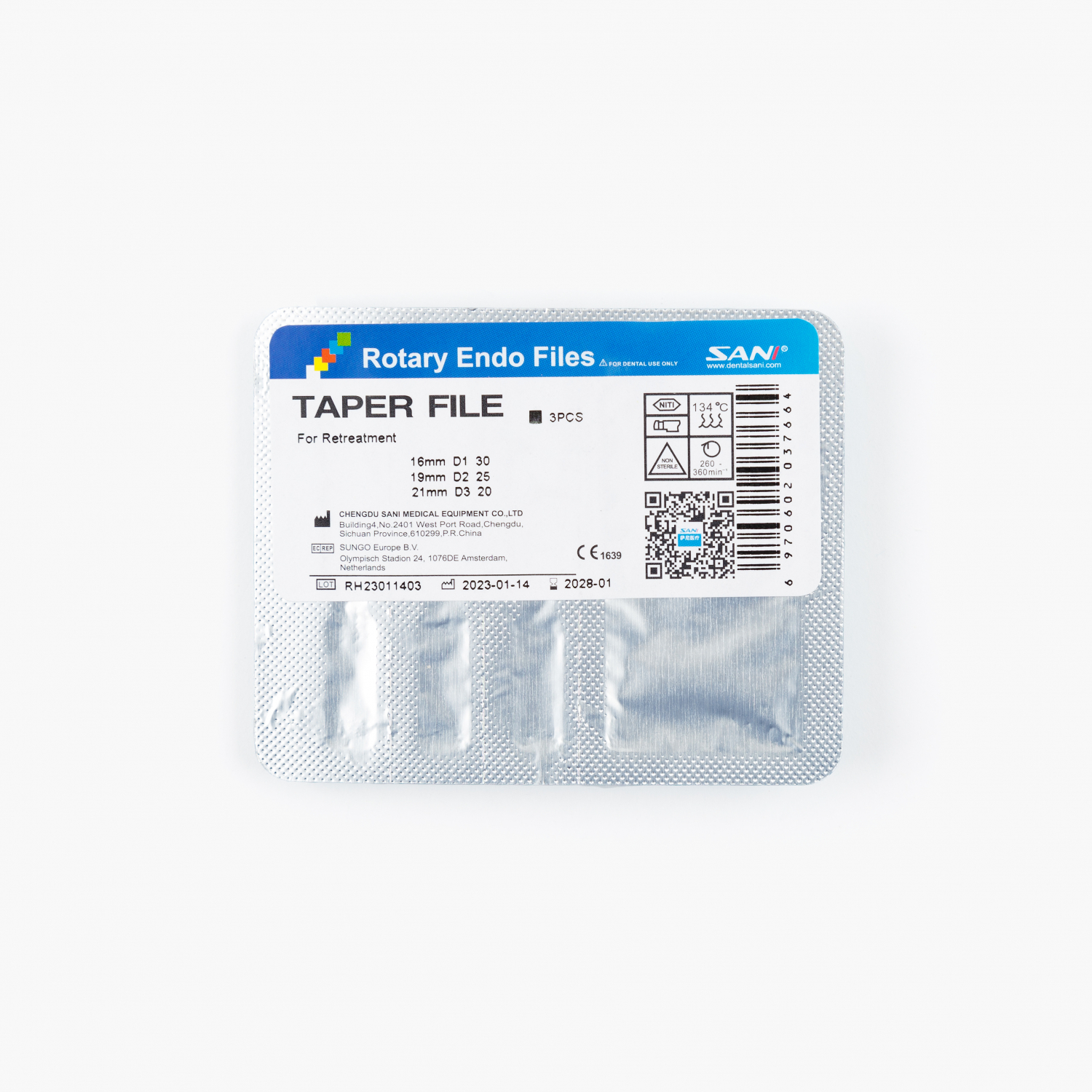 Файлы машинные для распломбировки Sani Retreatment Pack (3 шт) предназначены для удаления старого пломбировочного материала и повторной обработки корневых каналов. Комплект специально разработан для сложных клинических случаев, когда требуется аккуратное извлечение гуттаперчи и лечебной пасты без повреждения стенок канала.