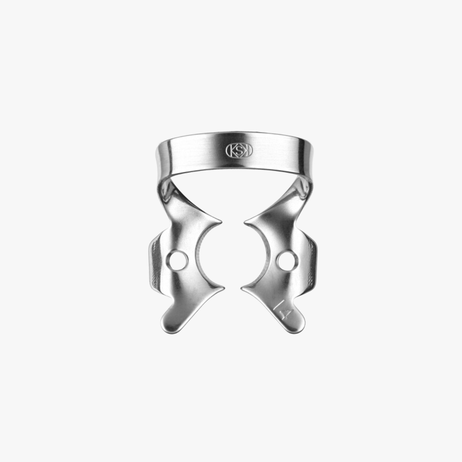 Кламп 14 предназначен для установки на частично прорезавшихся моляров верхней и нижней челюсти, а также зубов, имеющих значительное разрушение коронковой части или полностью разрушенную мезиальную стенку. Ножки небольшого размера. Применяется для работы с кариозными поражениями твердых тканей зуба любой локализации и на коронках зубов с невыраженным экватором.
