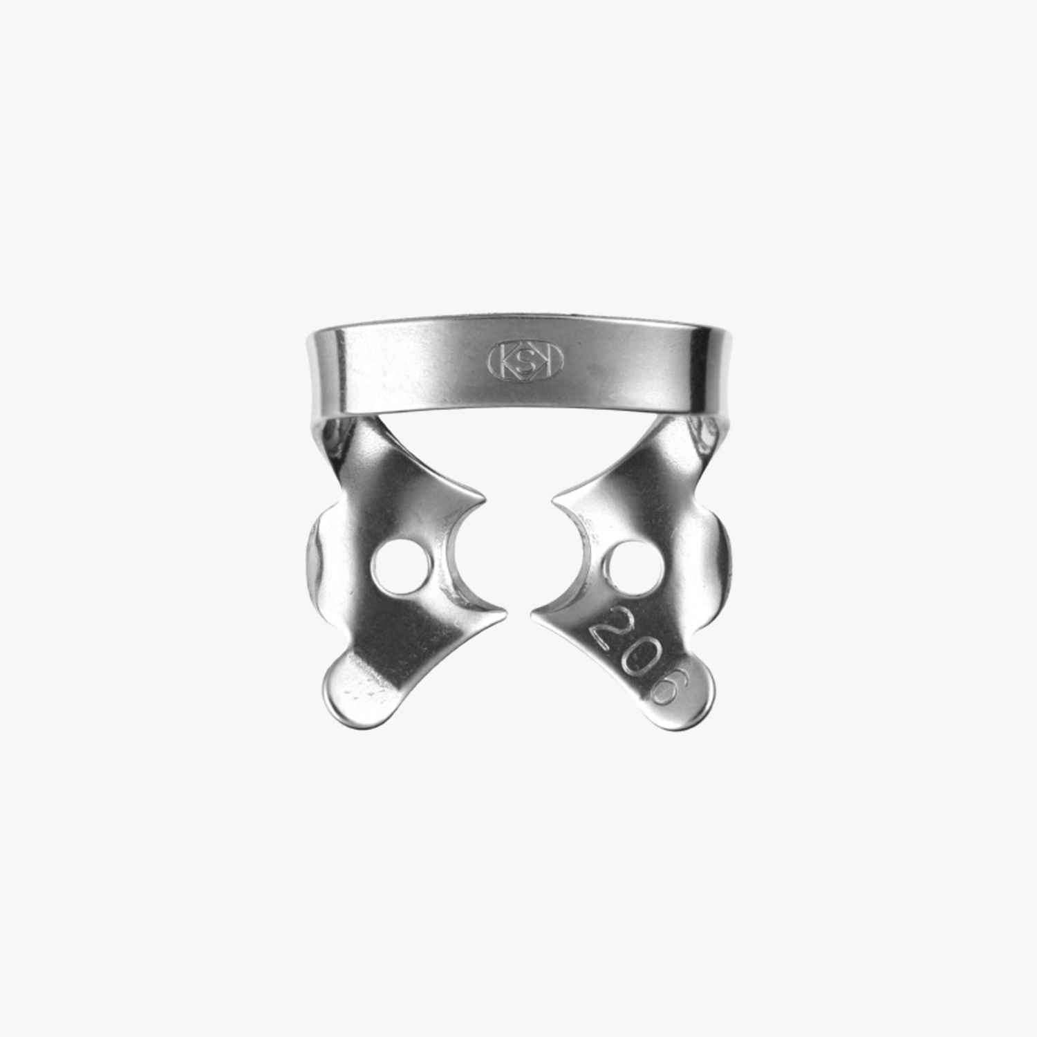 Кламп 206 предназначен для установки на верхние и нижние клыки и премоляры. В стоматологической практике применяется для зубов с сильно разрушенной или отсутствующей коронковой частью (если оставшаяся часть корня при незначительной ретракции десны позволяет получить четырехточечную фиксацию клампа углами) при лечении кариеса в сочетании с эндодонтией или выполнения чернового препарирования коронковой части зуба под ортопедическую конструкцию.