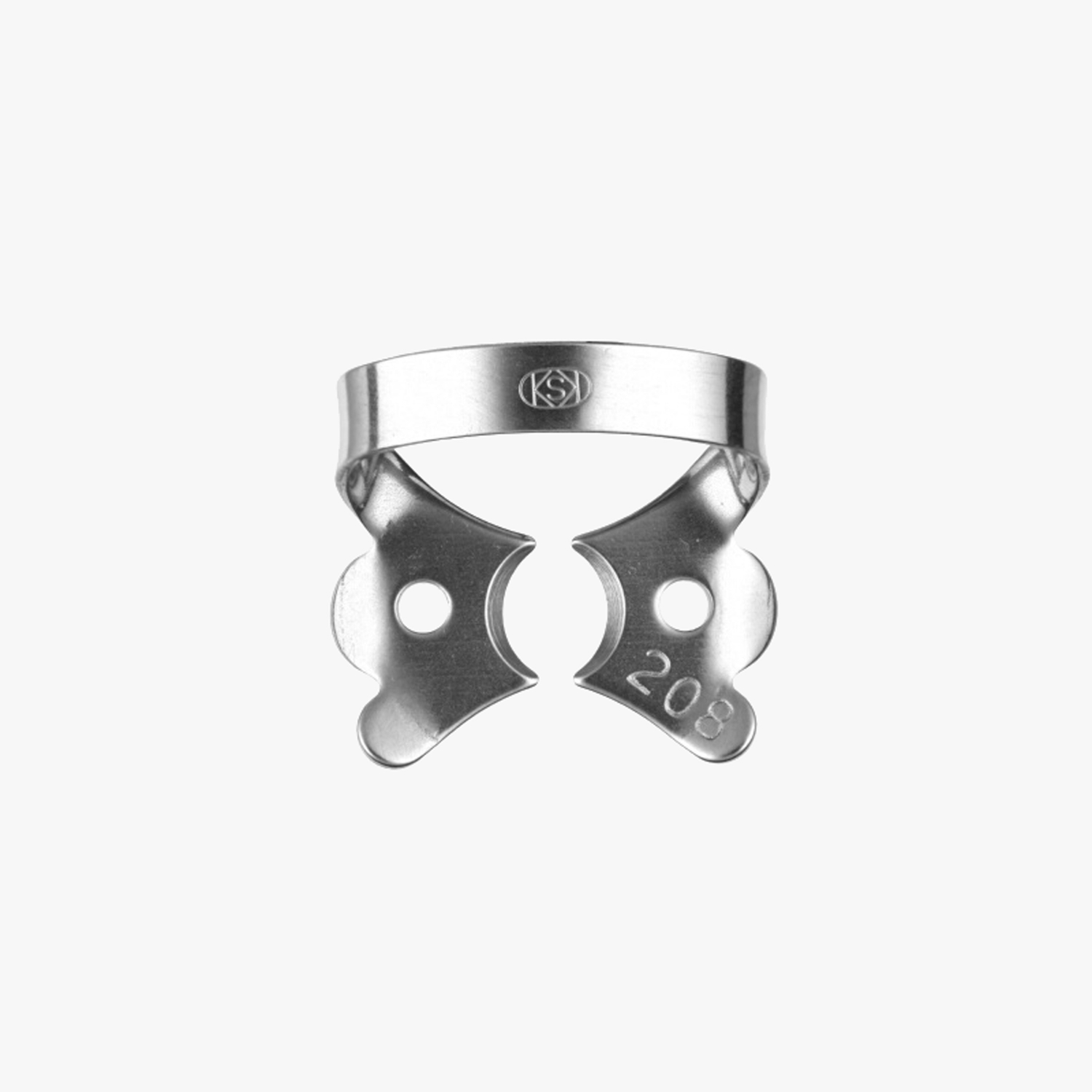 Кламп 208 предназначен для установки на верхние и нижние клыки и премоляры крупного размера. В стоматологической практике применяется для зубов с незначительными разрушениями коронковой части, сохраненной ферулой и выраженным экватором при лечении кариеса в сочетании с эндодонтией или для выполнения чернового препарирования коронковой части зуба под ортопедическую конструкцию.