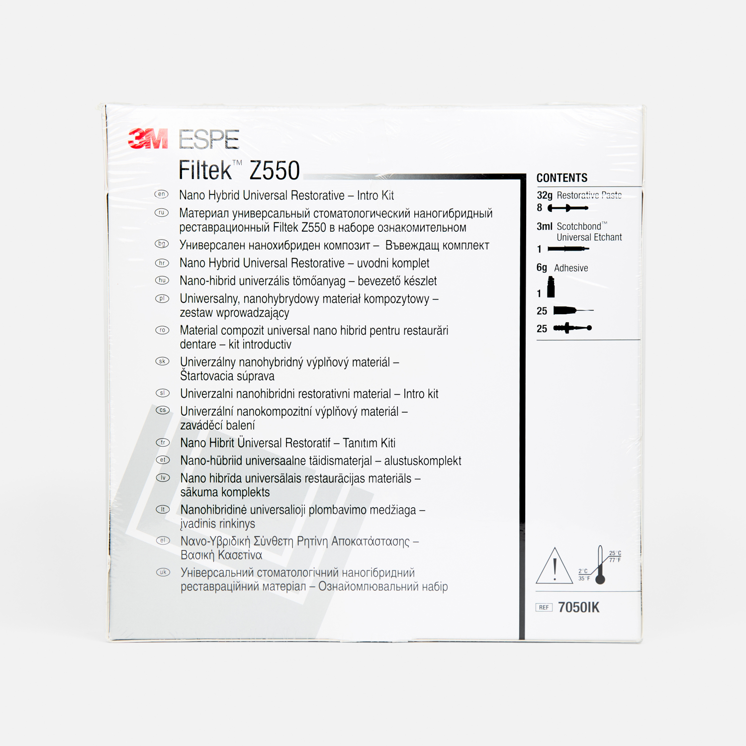 Универсальный наногибридный реставрационный материал Filtek Z550 является светоотверждаемым наногибридным композитным материалом, предназначенным для восстановления передней и боковой групп зубов. Материал используется совместно со стоматологическим адгезивом. Данный композитный материал выпускается в 12 оттенках, два из которых являются опаковыми. Все оттенки рентгеноконтрастные и флуоресцентные. Материал выпускается в шприцах.