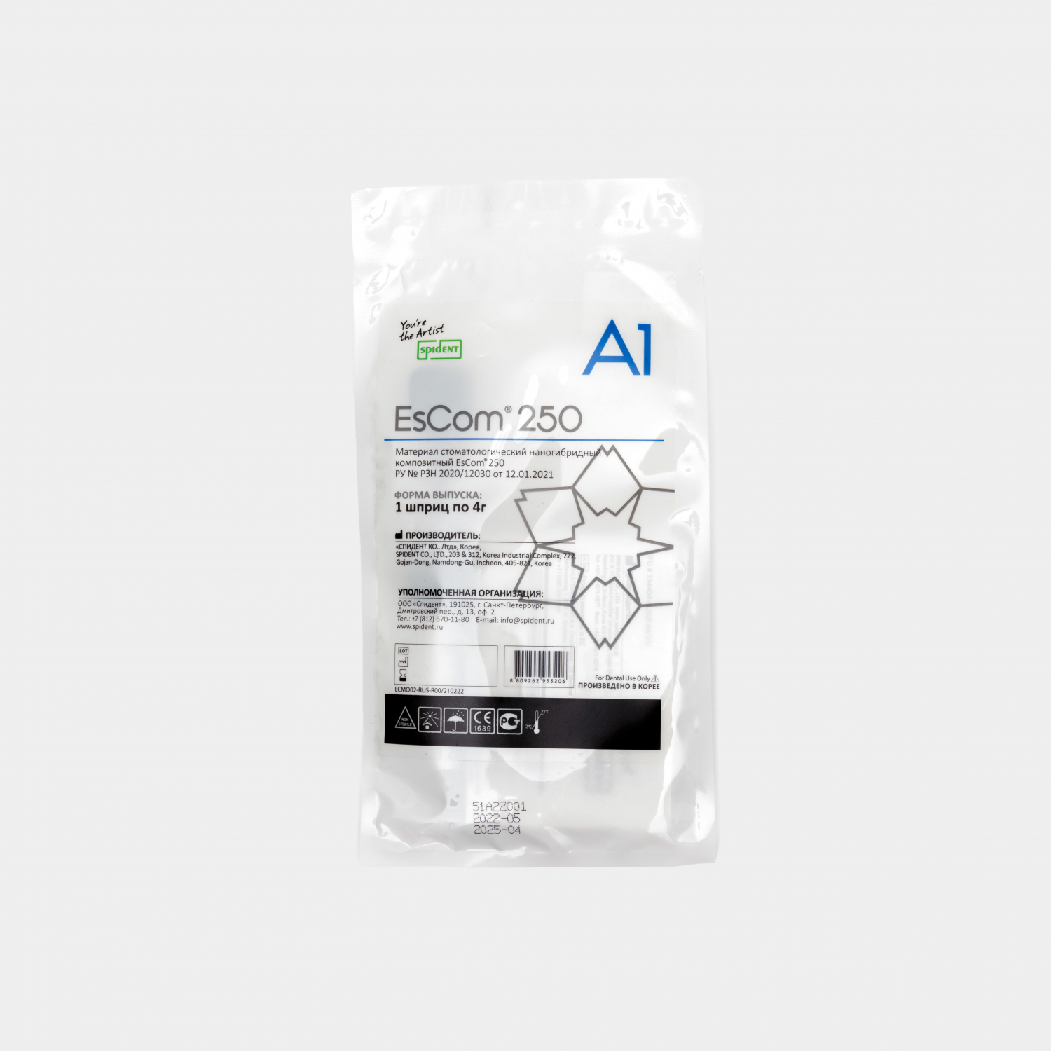 Spident EsCom 250 (Спидент Эском 250) светоотверждаемый наногибридный универсальный композит, предназначенный для проведения прямых реставраций полостей 1-5 класса жевательных групп зубов. EsCom 250 более плотный по структуре, чем EsCom 100, материал, что облегчает моделировку жевательных поврехностей.