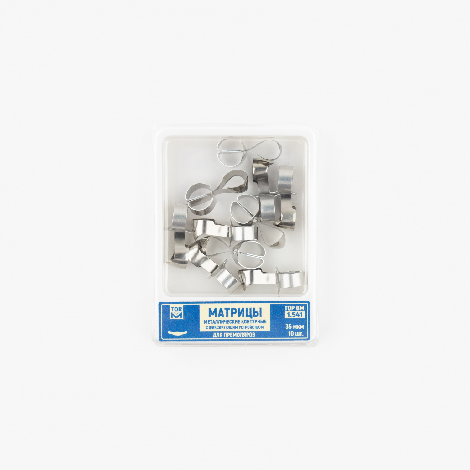 Матрицы контурные для премоляров, с одним центральным выступом, металлические ТОР ВМ, с фиксирующим устройством, 35 мкм (10 шт.).
