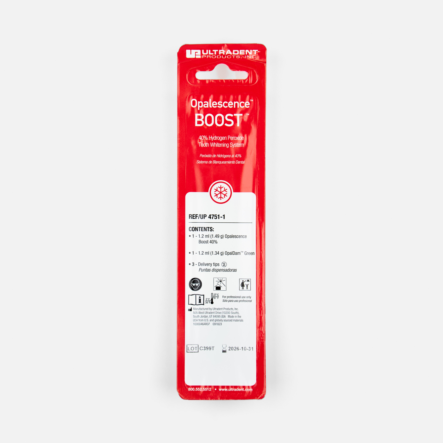 Основное действующее отбеливающей системы Opalescence Boost PF 40% перекись водорода разрушает зубную пигментацию и восстанавливает натуральный цвет зубов. В состав геля также входят нитрат калия для снижения чувствительности зубов и фторид, уменьшающий кариес и укрепляющий эмаль.