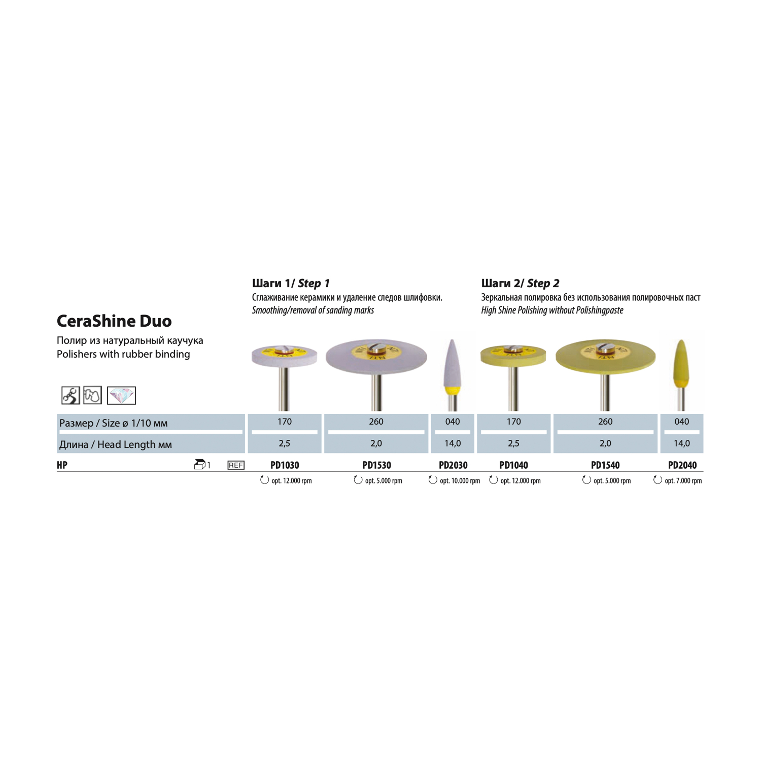 Двухступенчатая система полировки снижает затраты времени и походит для любых керамических материалов, включая диоксид циркония, гибридную керамику и дисиликат лития, сплавов неблагородных металлов и титана.