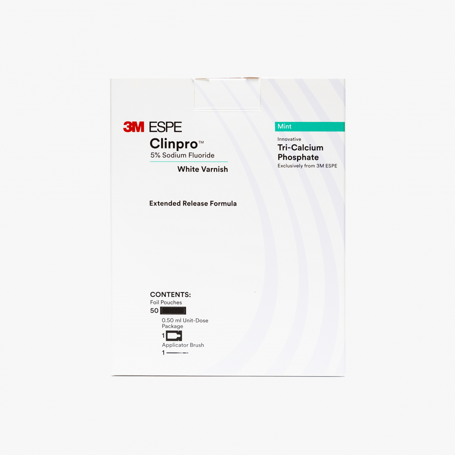 Препарат Clinpro White Varnish для фторирования и снижения гиперстезии наносится на предварительно очищенную и высушенную поверхность зубов с помощью индивидуальных кисточек-аппликаторов. В состав лака входят фторид натрия (5%), обеспечивающий высвобождение ионов фтора для укрепления кристаллической решетки эмали, и трикальцийфосфат (TCP) — запатентованный комплекс, который способствует осаждению кальция и фосфатов непосредственно в очаги деминерализации.