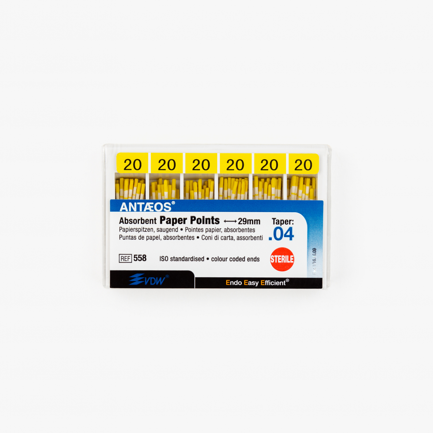 Бумажные штифты VDW диаметром 0.04 мм. Оптимально подходят для обработки узких и искривленных каналов передних зубов, а также в апикальной трети корневых каналов жевательных зубов. Штифты сохраняют структурную целостность даже при контакте с агрессивными средами, не оставляя волокон на стенках канала.
